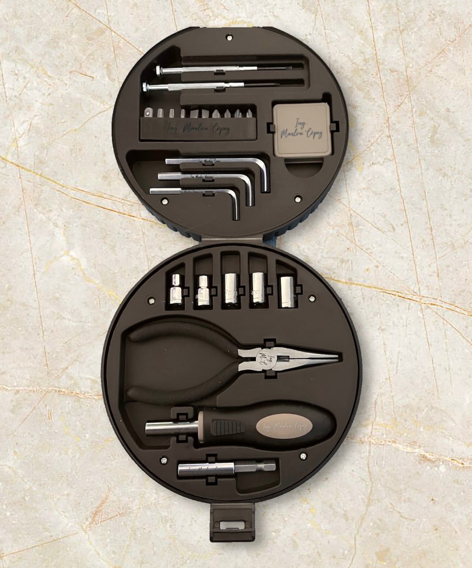 Herramientero en forma de llanta cubierta plástica con accesorios (bisturí, destornilladores pequeños, destornillador de puntas intercambiables y copas.)