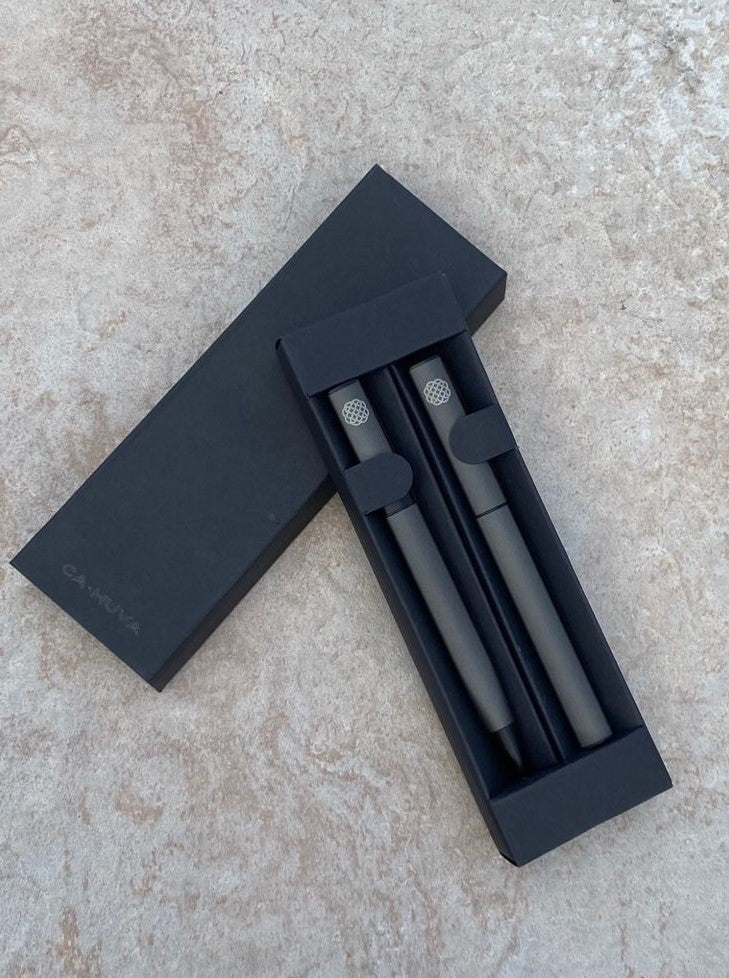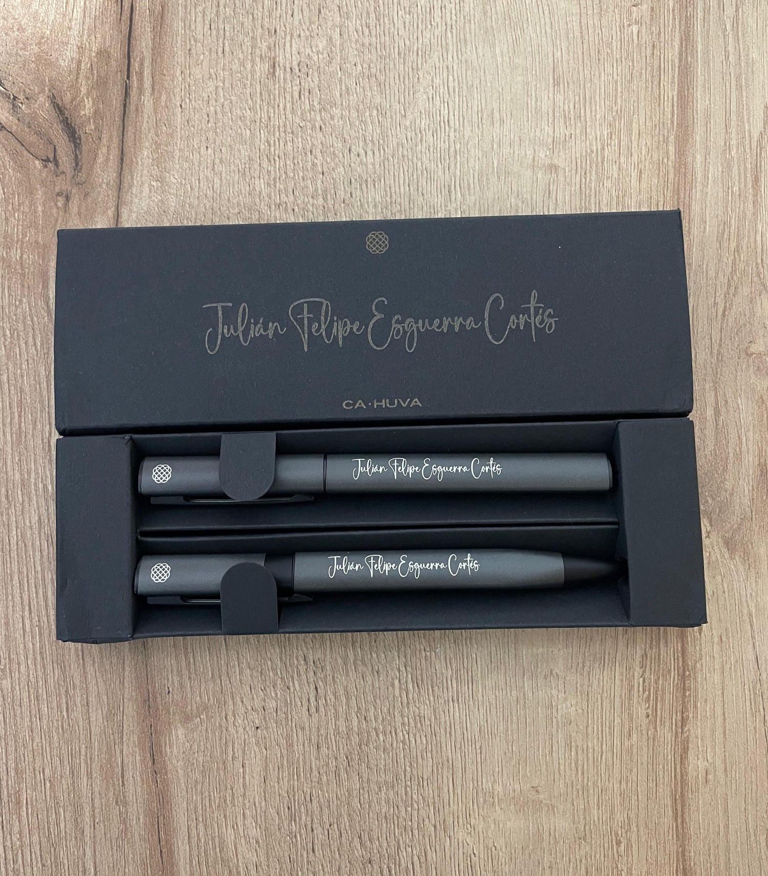 Regalo elegante y funcional. Set personalizado con dos accesorios (Set de bolígrafo ball point y roller pen) grabados a láser. También incluye caja de regalo, moño en color a elección y tarjeta.